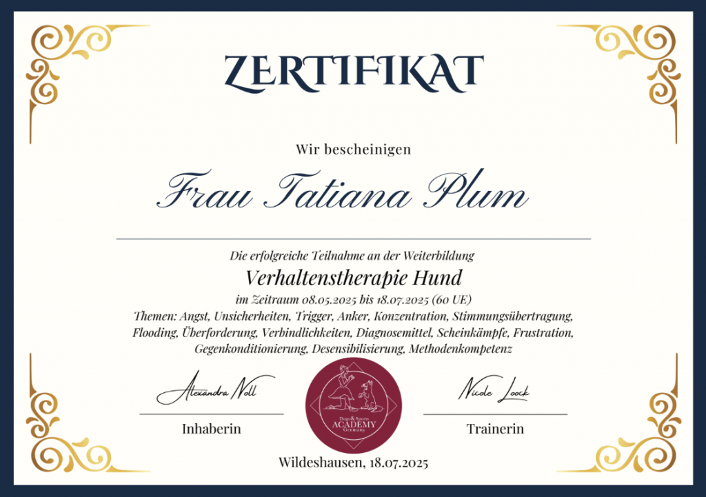 Ich bin zugelassene Hundetrainerin gem. §11 Abs. 1 Nr. 8f und zertifizierte Verhaltenstherapeutin für Hunde.